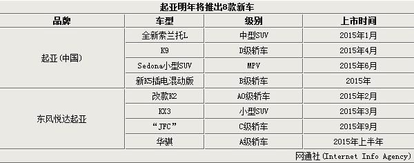 2014年即将结束,各大车企在冲击销量的同时,也正陆续推出了明年的新车规划以抢占更多的市场份额。起亚汽车也同样计划将推出多款车型来竞争明年的汽车市场。近日,媒体通过对起亚明年新车消息的梳理后发现:起亚汽车将在明年推出包括全新索兰托L在内的8款新车,覆盖了SUV,轿车及MPV各个领域。