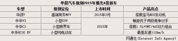 华晨汽车于去年年底时正式发布了全新品牌“华颂”,并同期推出了首款车型“华颂7”。随着这款重磅新车的公之于众,也开启了华晨自主品牌在2015年新的征程。日前,媒体对华晨汽车今年的产品投放计划进行梳理汇总后发现:包括华颂7、中华V3、中华C3以及中华H230 EV四款车型均将计划于今年年内实现投产。值得注意的是,这四款车的推出将会帮助华晨自主品牌覆盖多个细分市场。