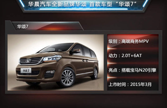“华颂7”是华晨汽车旗下的首款高端MPV,同时也是“华颂”品牌的首款车型。这款全新的MPV车型是由华晨集团、麦格纳以及BMW集团设计工作室三方联合设计打造。对于新车的设计风格,华晨汽车集团控股有限公司董事长、总裁祁玉民先生表示:“华颂7”是融合了欧洲设计风格和东风美学打造的新车型,将成为国内的商务座驾。