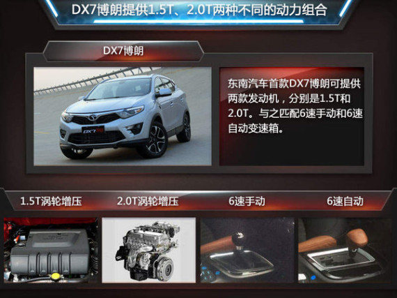 在动力总成方面,DX7博朗也开创了东南汽车的多项先例。左自生总经理表示:东南汽车DX7博朗提供航天三菱的1.5T和2.0T两款涡轮增压发动机,其中1.5T发动机进行动力升级后,最大功率可达113kW,峰值扭矩达210Nm。可匹配6速手动和6速手自一体变速箱。值得一提的是2.0T发动机和6速自动变速箱都是首次应用在东南汽车的车型。