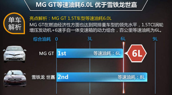 通过MG GT与雪铁龙世嘉两款车型在多路况与车载互联系统的全方位体验,不难看出,在动力性能和燃油经济性方面,MG GT采用1.5T+6AT的动力组合更具优势。这一动力组合也带来了9.8S的百公里加速时间、6L/100km的等速油耗。世嘉采用1.6L+4AT的动力组合,在动力性能和燃油经济性方面略逊于MG GT。车载互联方面,MG GT较世嘉拥有更加智能化的车载互联系统,配备手机车机双屏智能互联、3G、wifi、蓝牙三网覆盖全时在线等实用性功能。综合而言,MG GT相比世嘉更具竞争力,更符合时下年轻消费者的青睐。