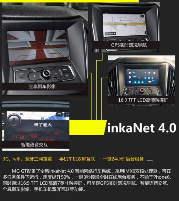 最后我们从两款车型的互联驾驶系统进行分析,MG GT采用inkaNet 4.0智能车载互联系统,通过16:9 TFT LCD红外触控7英寸液晶屏,可以呈现GPS实时路况导航、智能语音交互、全息倒车影像、手机车机双屏智能互联、3G、wifi、蓝牙三网覆盖全时在线、一键24小时后台服务等诸多功能。同级的世嘉车型也配备多媒体系统,集成GPS导航系统、定位互动服务等足够满足日常生活所需的科技配置。相比之下,MG GT的inkaNet 4.0车载互联系统显得更加智能。