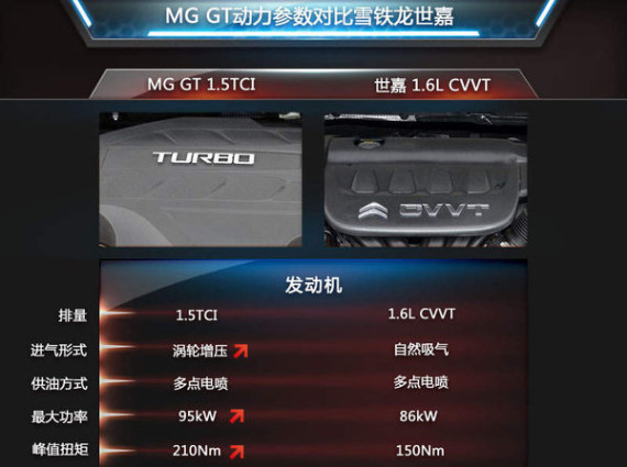 在本文中,我们将不再赘述车辆外观的差异,尤其是家用轿车,消费者每个人都有自己的审美标准,只要看着顺眼符合自身品味即可。首先我们从两款车型的动力系统来分析,MG GT 1.5T车型搭载的是1.5TCI涡轮增压发动机,可实现95kW的最大功率和210Nm的峰值扭矩。与雪铁龙-世嘉搭载的是1.6L CVVT自然吸气发动机相比,MG GT的动力性能略占优势。除此之外,MG GT匹配的是6速手自一体变速箱,而世嘉匹配的则是略显老旧4速手自一体变速箱。