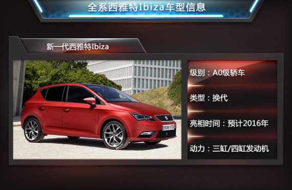 从之前发布的预告图来看新一代西雅特Ibiza外观方面继承了现款车型的大部分理念,如X型前脸线条以及双腰线设计,而换代新车对车身双腰线设计以及前大灯组进行了小幅修改。据报道,新车在配置方面或将有所提升,有望配备LED前大灯、自适应减震系统以及雷达安全系统等高科技配置。另外,全新一代西雅特Ibiza有望于2016年正式投放。