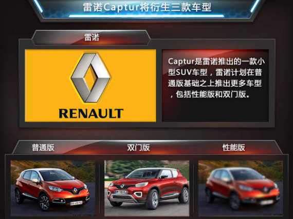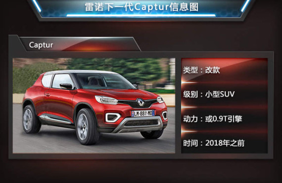 雷诺Captur是一款小型SUV,基于日产-雷诺联盟B平台打造而来,与其同平台的还有雷诺Clio与日产Juke。今年五月,东风雷诺将以进口形式率先在国内销售。当这款小型SUV正在努力开拓市场之时,该车有望推出改款车型,近日,德国媒体Autobild透露:2018年之前雷诺Captur有望推出改款车型,同时该车还将推出双门版本,进而与标致2008等车型竞争。