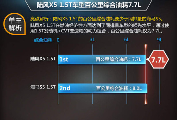 根据国家工信部的数据,陆风X5 1.5T搭载的动力是由沈阳航天三菱生产的4A91T系列发动机,最大功率可达110kW。据了解,该款发动机目前已被使用在包括东南V5菱致和V6菱仕等多款车型上。在传动方面,与1.5T发动机相匹配的是拥有成熟技术的CVT变速箱。得益于这对动力组合的使用,陆风X5 1.5T车型的百公里综合工况油耗仅为7.7L,领先于同排量的海马S5。