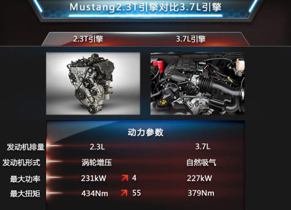 作为一款跑车,动力性能仍然是其最重要的评价标准。搭载小排量发动机后,Mustang的动力性能不仅没有下降反而得到了提升。得益于燃油缸内直喷、涡轮增压和双独立可变气门正时系统三大关键技术的使用,Mustang2.3T引擎最大功率为231kW,最大扭矩达到434Nm。与此前Mustang搭载的3.7L自然吸气引擎(最大功率227kW,最大扭矩379Nm)相比,2.3T引擎最大功率提升4kW,最大扭矩提升55Nm。