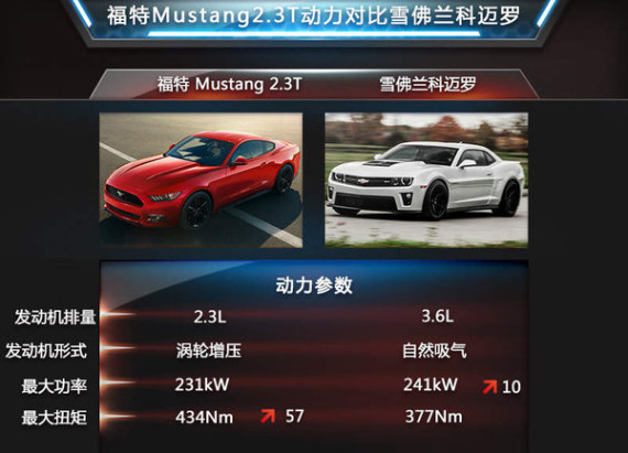 与同为美式跑车的雪佛兰科迈罗对比来看,科迈罗搭载的3.6L引擎最大功率为241kW,最大功率377Nm,Mustang搭载的2.3T引擎最大功率落后10kW,最大扭矩领先57Nm。Mustang的动力性能在同级别车型的竞争中仍将保持一定优势。此外,经典的5.0 GT Mustang也将在未来引入国内销售,为车迷提供更丰富动力配置的车型选择。
