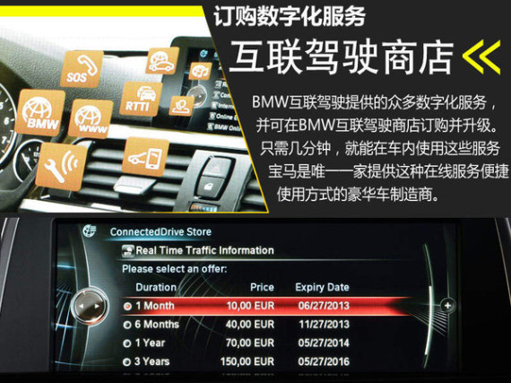 BMW互联驾驶概念下提供了众多数字化服务,可通过普通家用电脑或直接从车内联网。在 BMW互联驾驶或BMW在线(BMW Online)下,有一个专门的商店菜单项,可通过iDrive控制器进行选择。操作像熟悉的智能手机应用商店一样简单,其中会显示所有可用服务和已订购服务。输入在客户端设置的密码后,即可直接订购包括非固定期限服务在内的各项服务,片刻之后就能在车辆中使用。订购数字化服务和功能时,将实现最大的灵活性。
