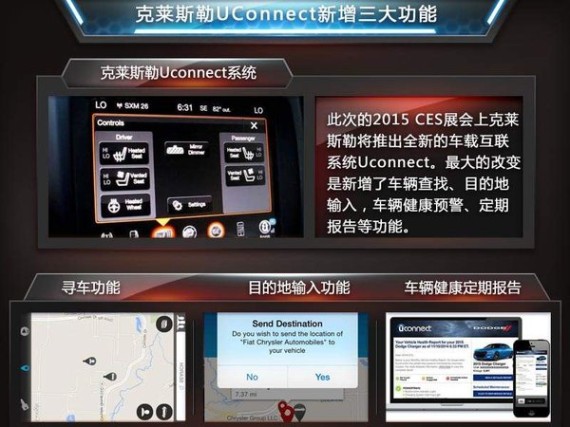 在此次的2015 CES展会上克莱斯勒将推出全新的车载互联系统Uconnect。其中最大的改变是车辆查找功能。不少车主可能都碰到这种车情况,将车子停放在停车场,结果回来的时候找不到自己的爱车。而车辆查找功能可以让车主通过智能手机向车辆发出指令,如果车主忘记车辆停放的位置,可以通过远程控制鸣笛来寻找车辆(对于小编这种健忘的女生老说,这真是福音啊)。