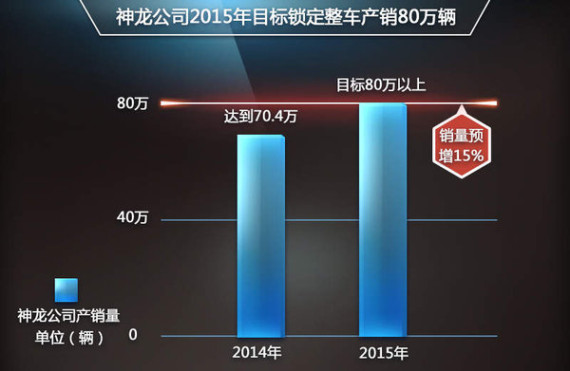 神龙公司近年来进入了飞速发展的阶段,其整车产销量一年迈入一个新台阶。该品牌2012年全年销量为44万辆,到2013年该数据攀升到55万辆。而刚刚过去的2014年,神龙公司实现了整车销售704,016辆,同比2013年劲增28%,且销量增幅是行业平均水平的两倍多。面对如此优异的销量成绩,在刚刚进入的2015年,神龙公司制定了新的销量标。近日,神龙公司官方透露,该品牌2015年的整车产销目标锁定在80万辆,销量预增或达15%。此外,神龙公司将投放四款全新车型,进一步提升市场竞争力。
