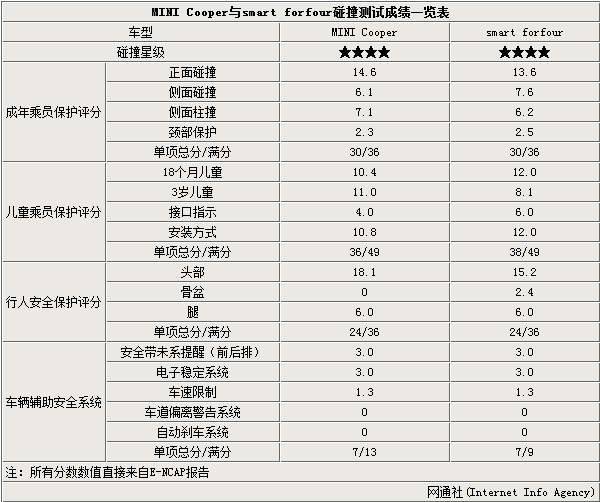 本次参试车型为欧版2014款MINI Cooper和smart forfour,这2款小车在E-NCAP的碰撞测试评级中全部为4星。从各大项总成绩来看,2车不分伯仲,成年乘员保护、行人安全保护以及车辆辅助安全系统3大项均取得了一致的成绩。在儿童保护大项中,smart forfour的成绩较MINI Cooper高出2分。车辆辅助安全测试大项中,车道偏离警告系统和自动刹车系统2车都没有得分。需要指出的是,MINI Cooper在侧面碰撞测试中,模拟驾驶员假人胸部有受伤风险。而smart forfour在正面碰撞和侧面柱撞测试中,模拟驾驶员假人胸部均有受伤风险。(在欧洲参加测试的车型最终碰撞成绩仅供国内消费者参考)