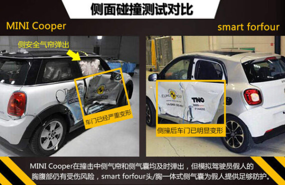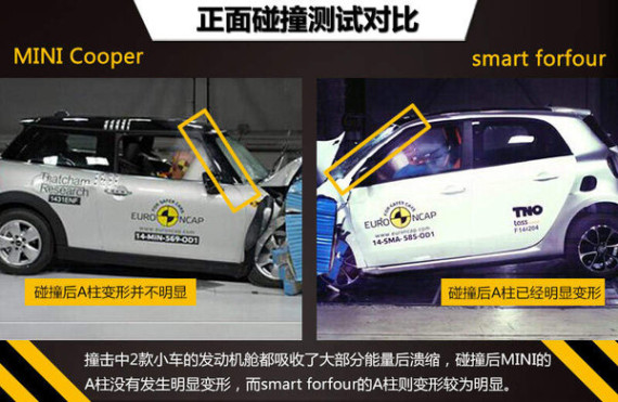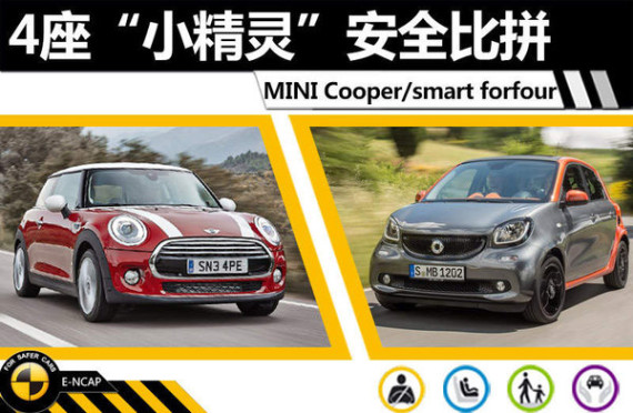 MINI拥有悠久文化底蕴,在传承历史的同时诞生了多款经典车型,其中新一代MINI Cooper近期已在国内上市,虽然外观内饰采用了新颖的设计并换装了全新发动机,但之前经典的元素也都得到保留,它依然是车流中一款小巧可爱的精灵。另一款公认的都市小精灵则是smart,新一代smart不仅在整体造型上较现款车有了脱胎换骨的变化,更是推出了4门4座版本车型--smart forfour,并即将在今年登陆中国市场。在安全方面,这两款可以轻松搭载4个成人的超萌小车到底孰胜孰负,本期我们将带大家了解一下它们在E-NCAP碰撞测试中的表现。