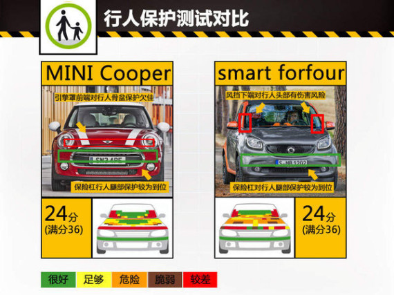 行人保护测试满分36分,MINI Cooper和smart forfour的成绩一致,均为24分。这2款小车在测试中对行人腿部的保护比较到位,全部取得了6分满分;但它们的发动机罩前端区域对行人骨盆保护均欠佳,MINI Cooper行人骨盆保护没有得分,smart forfour成绩为2.4分;此外,2车的发动机罩中间区域可以对行人头部起到一定保护作用,但风挡下端区域在测试中却对行人头部保护欠佳。值得一提的是,MINI Cooper参试车装备了行人头部保护系统,当传感器探测到与行人发生碰撞时,此车的发动机罩可以自动提升,可有效地降低被撞击的行人头部直接发动机罩冲撞所产生的伤害。因此头部保护MINI Cooper得分较高,为18.1分,smart forfour的成绩是15.2分。