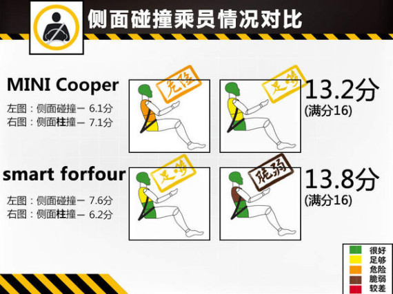 侧面碰撞满分8分,MINI Cooper只拿到6.1分,在撞击中,此车的侧气帘和侧气囊均及时弹开,模拟驾驶员假人的头部受到良好的防护,但胸部和腹部受压力指数较高,此部位有受伤风险。smart forfour的侧撞成绩是7.6分,高出MINI Cooper1.5分。撞击中,此车的头/胸部一体式侧气囊及时弹出,对驾驶员假人的头部和胸腹部提供防护,撞击后假人头部受到了良好的防护,同时胸部受到的防护也是足够的。