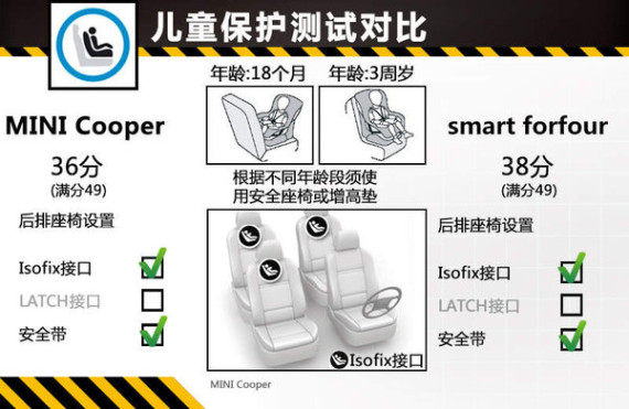 smart forfour在正面碰撞时,儿童座椅内的18个月模拟假人获得良好保护,3周岁模拟假人向前略有移动,仍被安全的约束在儿童座椅内,但颈部和胸部受力略高。侧面碰撞时2个儿童都受到良好保护。此车的副驾驶安全气囊均可以关闭,以便允许在座位上使用背向式儿童安全座椅,并能为驾驶员提供清晰的信息指示。这款4座小车在第二排座椅上提供了2个ISOFIX接口,所处位置操作较为方便,安装指示标识也非常清晰。儿童保护测试满分49分,MINI Cooper得分36分,较smart forfour低了2分。