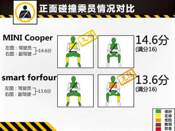 在正面碰撞测试中,MINI Cooper的前部吸能区吸附了绝大部分撞击能量后溃缩完好,碰撞后A柱无明显变形,驾驶舱保持了良好状态。撞击中前排正面安全气囊及时弹开,为模拟假人的头部提供良好防护,同时驾驶员假人胸部得到的防护也是足够的。数据读数显示前排假人的膝盖和股骨均受到良好保护,MINI表示对于身材不等和坐在不同位置的乘客此车提供相同的防护水平,但坐在不同位置也有导致膝部碰触仪表板部件的可能。smart forfour碰撞后A柱有较明显变形,撞击中前排安全气囊及时弹开,模拟驾驶员假人受到充足的防护,但数据读数显示前排副驾驶位置假人的胸部在碰撞后有受伤风险。同时前排2个假人的膝盖和股骨均受到良好保护,对于身材不等和坐在不同位置的乘客此车提供相同的防护水平。正面碰撞测试满分16分,MINI Cooper的成绩为14.6分,smart forfour成绩为13.6分。