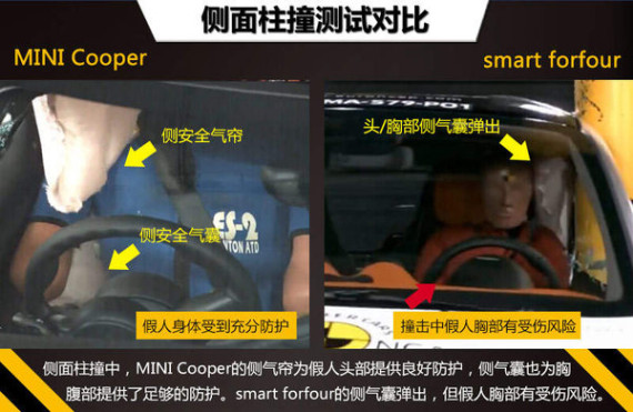 在严苛的侧面柱撞测试中,MINI Cooper的侧气帘及时弹出,为模拟驾驶员假人头部提供了良好防护,同时弹出的侧气囊也为假人胸腹部提供了足够的防护。smart forfour装备的头/胸部一体式侧安全气囊在撞击中及时弹出,假人头部得到良好的防护,但胸部有受伤风险。柱撞测试满分为8分,MINI Cooper和smart forfour的成绩分别为7.1分以及6.2分。