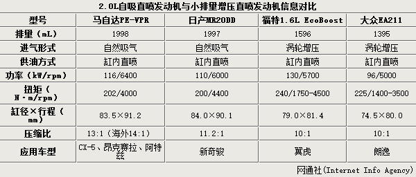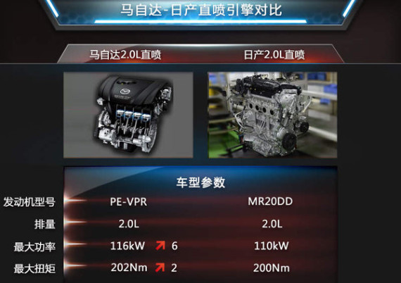 此外,搭载马自达2.0L直列四缸自然吸气缸内直喷发动机的车型在动力性能上也得到了提升。马自达阿特兹搭载了2.0L直喷引擎,通过对比排量相当、进气/供油形式相同的日产MR20DD发动机后发现,在功率和扭矩输出上,马自达2.0L直喷引擎将更胜一筹。