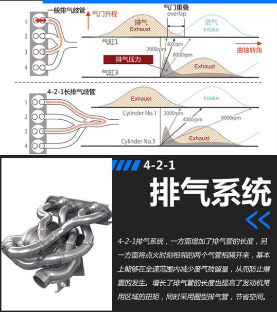 如图内,假设3号缸的排气阀打开后,产生的高压排气压力波会结束排气行程,到达准备进行吸气行程的1号缸。因此已经被排出的气体又被压回燃烧室内,增大了高温残留排气量。在4-2-1排气系统中,高压波传到其他缸体则需要较长的时间,其不良影响被限制在极地的转速区域,基本上可在全转速区域减少残留气体。