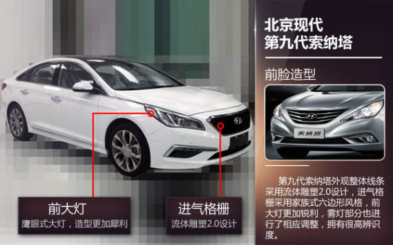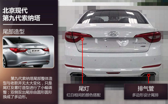 在外观方面,第九代索纳塔采用了全新家族式设计风格,进气格栅采用六边形,面积相对现款索纳塔有所增大,不规则造型的头灯棱角分明,与现款相比较而言更为犀利;下格栅则没有太大变化,雾灯造型更加硬朗。在尾部造型上,第九代索纳塔与现款相比较起来差别不大,只是红白两色相间的尾灯组造型进行了调整,尾部保险杠以及雾灯造型使得新车尾部层次感更加鲜明。