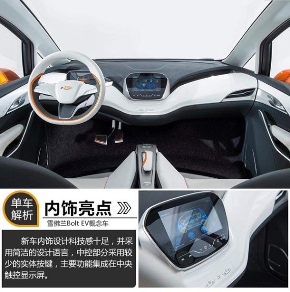 Bolt电动概念车内饰由浅色材料搭配黑色装饰构成基本色调,整体呈现前卫科技的视觉效果。内饰采用简洁的设计语言,中控部分采用较少的实体按键,主要功能集成在中央触控显示屏,十分符合未来新能源科技车型的设计理念。新车采用三幅式多功能方向盘,采用浅色材质包裹,质感十足。由于采用纯电动力,新车在变速器位置腾出了空间,飞翼式中控台下方主副驾驶位置为联通式设计,增添了乘坐驾驶的舒适性。