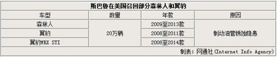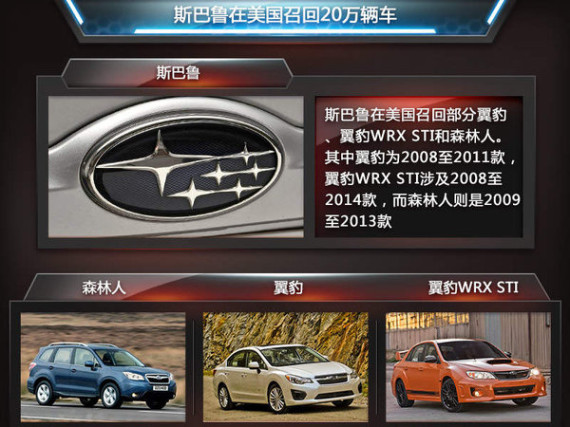 根据NHTSA公布的消息,此次斯巴鲁召回车型为翼豹、翼豹WRX STI和森林人。其中翼豹为2008至2011款,翼豹WRX STI涉及2008至2014款,而森林人则是2009至2013款,上述车型将有共计20万辆车受到影响。斯巴鲁汽车表示,目前未收到有关制动油管隐患而引发的事故报告,召回计划预计于本月26日开始实施。