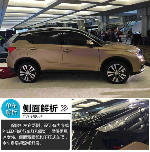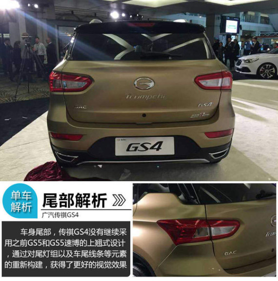 不同与前脸所追求的家族化,传祺GS4的整体车身和尾部则更多体现出了传祺设计师最新的设计思路。优雅紧致的车身线条不但与时下美学完美契合,而且还通过一系列细节处的打磨使这款新车具有很强的个性化标记。