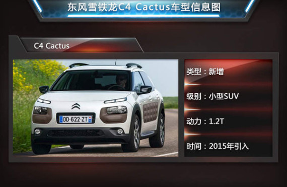 雪铁龙C4 Cactus是一款小型城市SUV,外观和内饰最大程度上沿用了概念车的设计。外观方面最大的亮点就是保留了概念车上Airbumps的技术,简而言之,该技术是在车门上使用一种软性材质覆部分车头和车门,有防腐耐用,并可抵御庆维刮擦的功能。内饰部分C4 Cactus也保留了大部分概念车上的设计,例如传统的机械指针表盘被简洁的数组仪表盘所取代,而中控台部分的7寸触摸屏可控制空调、多媒体系统以及导航等功能。