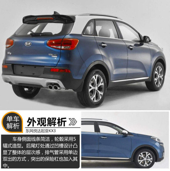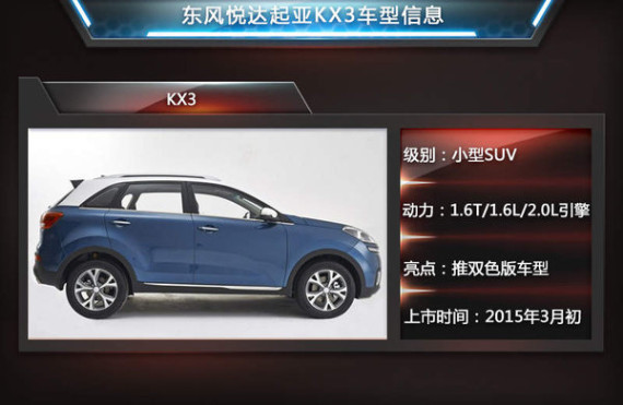 起亚汽车在去年的广州车展上亮相了KX3的概念车型,并定于在今年3月初正式上市销售。新车定位于小型SUV,并与北京现代ix25同平台打造。随着上市日子的临近,东风悦达起亚官方透露,小型SUV KX3将在本月27日公布中文新命名。据推测,这款新车或将与目前起亚旗下“智跑”和“狮跑”采用相同的命名体系。