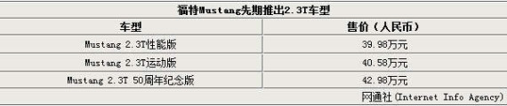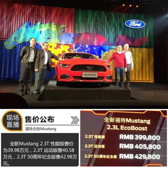 福特Mustang (配置|询价)(野马)诞生50年来,累计销售已超过920万辆,在海外市场拥有不俗的口碑,如今全新福特Mustang将以进口方式正式进入中国市场。“Mustang绝不只是一款车型,它是福特品牌的核心和灵魂所在。”福特中国董事长兼首席执行官罗礼祥表示,“能够向中国消费者推出全新福特Mustang车型我们深感荣幸,希望更多的中国消费者能与Mustang自由、乐观的品牌精神产生共鸣。” 全新福特Mustang于1月20日正式在国内上市,先期推出搭载2.3T引擎的车型,售价区间为39.98万-42.98万元。