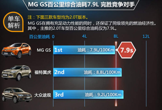 得益于90多年来积攒的高性能车的研发经验,MG将这些技术应用到了首款SUV车型上面。根据MG官方数据,其零至百公里加速时间仅需8秒,要知道这对于一款有着“相当重量”的SUV车型已实属不易。与此同时,MG GS还拥有非常出色的燃油经济性,2.0T车型的百公里综合油耗为7.9升。
