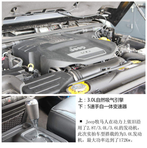 2015款牧马人将沿用现款车型搭载的2.8T柴油发动机和3.0L和3.6L两款汽油发动机。其中2.8TD涡轮增压柴油发动机,最大功率147kW,2000rpm即可达到峰值扭矩460N·m。3.0L发动机最大功率172kW,峰值扭矩285·m。与发动机匹配的均为5速手自一体变速箱,同时通过分动箱来切换驱动方式,在低速四驱模式下,传动比为2.72:1,扭矩被放大到775Nm,能力十分出众。