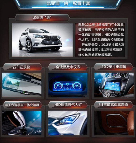 丰富的配置“唐”领先于其他对手,12.1英寸超视觉TFT全液晶数字仪表、电子换挡的六速手自一体自动变速器、HID透镜式氙气大灯。安全方面配备了ESP车辆稳态控制系统,并且配有行车记录仪。10.2英寸超大高清电容触摸屏、5.1声道DTS高清环绕立体声响系统配有高保真9扬声器等全系标配配置。