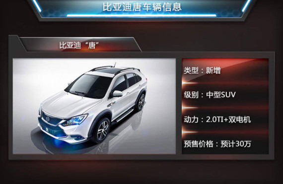 在2014年比亚迪“秦”占据中国新能源车型销量榜首,共销售1.4万辆。比亚迪的SUV车型S6和S7共销售10.5万台。在SUV市场火热的今天,新能源动力和SUV车型双重身份“唐”的重磅推出,为比亚迪这一细分市场增添竞争力。