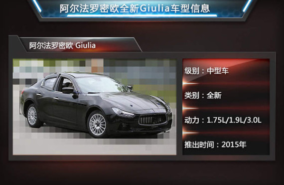 阿尔法罗密欧将在2015年下半年推出的全新中型车或将是全新一代中型车Giulia。从谍照图来看,新一代Giulia有望配备独立显示屏,并拥有车辆行驶模式选择键,可对发动机、变速器管理系统等参数进行调节。顶级车型Giulia GTA将搭载来自Ghibli 的3.0L V6双涡轮增压缸内直喷引擎,最大功率为302kW,最大扭矩达到550Nm,足以竞争奥迪RS4、宝马M3。低配车型则将搭载经过改进的1.9L JTS直列四缸涡轮增压引擎,且有望搭载来自4C车型的1.75L直列四缸涡轮增压高功率引擎和JTDm柴油引擎。与发动机匹配的将是6前速手动变速器以及6前速双离合变速器,搭配Ghibli动力总成的车型则可以选择8前速自动变速器。
