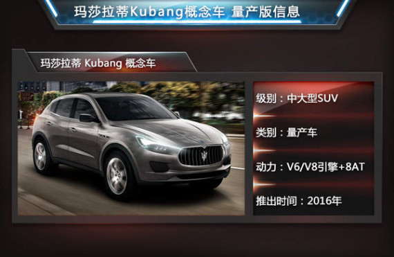 Kubang SUV概念车是玛莎拉蒂旗下首款SUV车型,Kubang概念车早在2011年的法兰克福车展就已经发布。按照玛莎拉蒂新车规划,量产版车型预计将于2015年发布,新车在量产后或将命名为“Levante”。动力方面,新车将搭载两种版本的V6双涡轮增压引擎,最大功率分别为257kW和313kW,以及最大功率为412kW的V8引擎。此外新车还将配备四驱系统,以及8AT变速器。