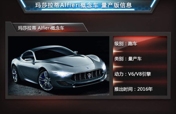 在2014年日内瓦车展上亮相的玛莎拉蒂Alfieri概念车,将于2016年量产。作为玛莎拉蒂旗下的入门级豪华轿跑车型,未来量产后将包括Coupe硬顶版和敞篷版两种车型,分别在2016年及2017年推出,竞争对手将锁定保时捷911和捷豹F-TYPE等车型。外观方面,玛莎拉蒂Alfieri概念车借鉴了一部分家族风格,进气格栅的造型更大,搭配犀利的车头灯和蜂窝状的下格栅,运动气息十足。动力方面,量产版车型预计将搭载两种版本的V6双涡轮增压发动机,最大功率分别为310kW和331kW;以及最大功率为383kW的V8引擎,并将提供选装四驱系统。