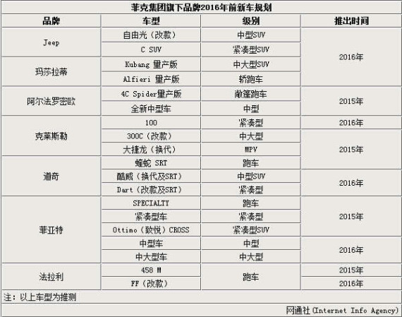 结合菲克集团此前公布的新车规划来看,阿尔法•罗密欧、玛莎拉蒂、Jeep、法拉利等品牌均将在2016年前推出多款新车产品:Jeep将在2016年推出一款全新的C-SUV车型以及自由光(Cherokee)改款车型;玛莎拉蒂将在2016年推出Kubang SUV概念车量产版和Alfieri概念车量产版车型;阿尔法罗密欧将在2015年下半年推出全新中型车以及4C Spider量产版车型;法拉利将在2015年推出458 M跑车,并将在2016年推出FF跑车的改款车型。