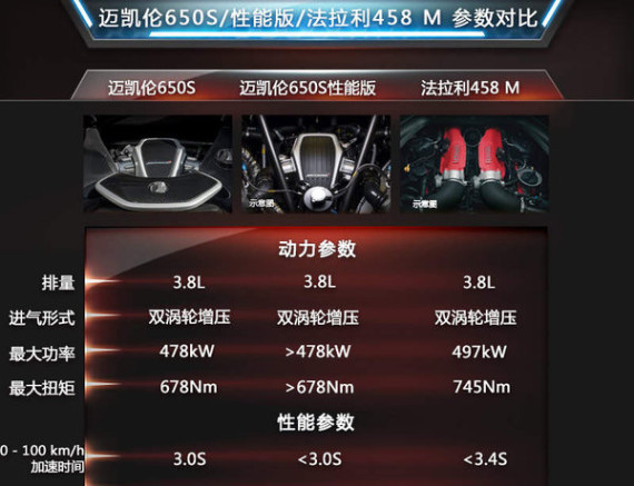 迈凯伦650S所搭载3.8L V8双增压引擎最大功率、最大扭矩分别为478kW和678Nm,而高性能版车型虽然搭载与之相同排量的引擎,但最大功率和最大扭矩均经过重新调教,在数值方面将再创新高。此前法拉利宣布搭载3.8T V8引擎的458 M将在今年3月日内瓦车展上首发,而迈凯伦在售的650S在动力上与法拉利458这款小排量新车仍有一定差距,为了保持与竞争对手的优势,迈凯伦即将推出的性能版新车在650S动力基础上做了全面提升,并且首发日同样选择了今年的日内瓦车展,可以看出其对标车型已经瞄准法拉利458 M。