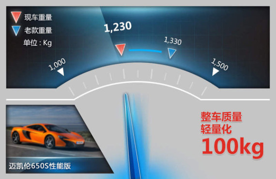 迈凯伦即将推出的这款新车,可以视作是650S的高性能版本,但未来新车命名或将不再包含“650S”字样,而有望是一款更高规格车型。新车所搭载的3.8T V8引擎最大功率和最大扭矩均将超过650S的动力参数。据悉,由于大量使用了轻量化复合材料,该车相对于650S进一步“减重”达100KG,整车重量仅约1230KG,在继续增大推重比的同时也进一步起到节能减排的作用。更轻的车重配合更强的动力,使迈凯伦这款高性能版车型的零到百公里加速度控制在3秒之内。此外,这款新超跑的外观将会借鉴P1的设计风格,这也使新车整体视觉更具有攻击性。