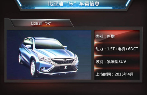 比亚迪称2015年为企业的“SUV元年”,规划推出多款SUV车型。今年一季度比亚迪首款新能源车型“唐”将正式推向市场,随后又一重磅插电式混合动力SUV“宋”也将推向市场。近日,比亚迪官方透露:比亚迪“宋”将搭载1.5TI发动机加6DCT双离合变速箱,有望于今年4月首发亮相。