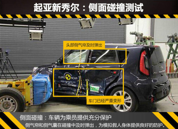 在正面的碰撞测试中,起亚新秀尔的发动机舱分别吸收了大部分能量后溃缩,碰撞后A柱变形并不明显,驾驶舱基本保持完整。安全气囊在撞击中均及时弹开,充分保护了模拟驾驶员和乘客假人的头部和胸部;但数据读数显示碰撞后车辆转向柱和仪表板下端部件的入侵对驾驶员假人右侧小腿以及副驾驶乘员左侧大腿有造成伤害的风险。正面碰撞测试满分16分,新秀尔仅拿到12.2分。