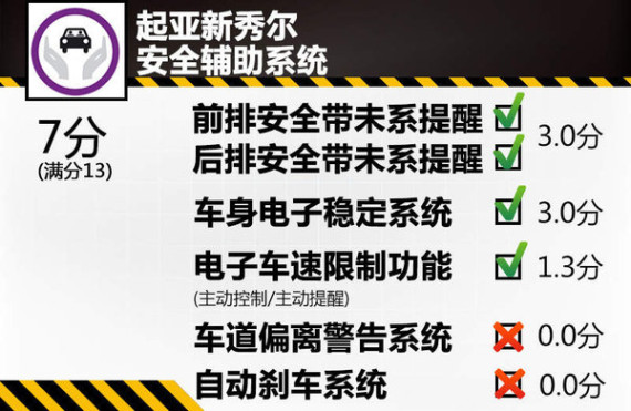 在车辆辅助安全系统评测环节,起亚新秀尔丢分较多,最终成绩为7分,而满分是13分。车道偏离警告系统和自动紧急刹车,此车这两项主动安全系统均没有装备,以至没有拿到成绩。但车身稳定系统以及前后排安全带未系提示系统都是新秀尔的标准配置并拿到满分。此外,电子限速系统虽然是测试车辆的选装配置,但E-NCAP预测全新傲虎的大多数车型会配备该系统,因此过评估并获得加分。
