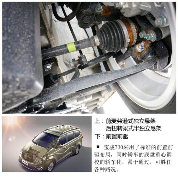 宝骏730拥有标准化的轿车底盘结构,前麦弗逊式独立悬架/后扭转梁式半独立悬架,前置前驱布局,宝骏730更是由世界顶级的英国莲花工程进行调校,低重心设计,让整车操控性、静谧性、舒适性达到均衡状态,并可轻松应对各种路况,具有较高的通过性以及高稳定性。所搭载博世ESP的宝骏730,可以实时监测轮胎状态,一旦发生打滑,能迅速响应,准确实施制动,这些都是家庭的出行最大的安全保障。
