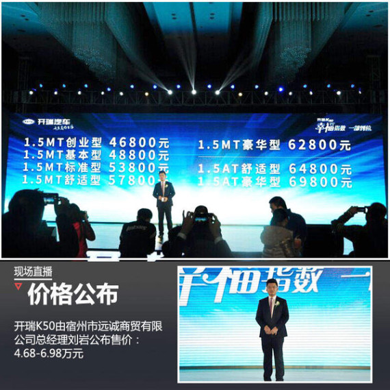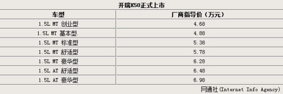 以轿车化理念打造的开瑞首款7座宽体MPV车型,开瑞K50今日于合肥北城世纪金源大饭店发布上市。售价区间为4.68-6.98万元,共推出7款配置车型,搭载曾获“年度十佳发动机”称号的ACTECO1.5L发动机匹配5速手动和自动变速箱,至此,开瑞汽车的产品矩阵已囊括微客、微货、MPV三大平台、五个系列车型。