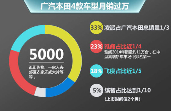 2014年广汽本田已经陆续推出了多款搭载本田FUNTEC技术的新车型,根据广汽本田最新公布的数据:2014年全年终端销售46万台,增长16.2%;全年发车数量达到480,060台。这其中四款主力车型的成绩最为突出,第九代雅阁;广汽本田小型SUV缤智;紧凑级轿车凌派和第三代飞度均实现月销量过万。