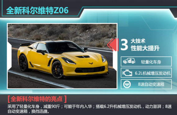 全新一代的科尔维特Z06采用了通用众多的尖端技术。科尔维特首席工程总监Tadge Juechter表示:“科尔维特Z06是我们在科尔维特赛车和量产车之间实现技术共享的卓越实例。”在众多新技术之中,轻量化车身是最大的亮点。新一代的科尔维特Z06使用了更为坚固的铝制车身结构,重量相比较老款减轻了90斤,这也意味着新车型拥有更好的加速、操控以及燃油经济性。