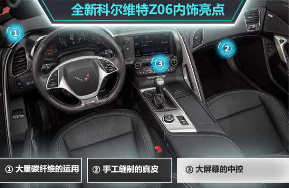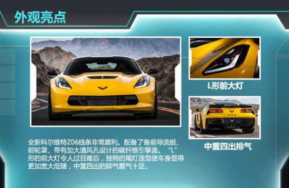 外观上,全新科尔维特Z06线条非常犀利。配备了备前导流板、前轮罩、带有加大通风孔设计的碳纤维引擎盖。“L”形的前大灯令人过目难忘,独特的尾灯造型使车身显得更加宽大低矮,中置四出的排气霸气十足。内饰方面,车内大量使用了碳纤维材质以凸显战斗气息,并采用了全手工缝制的真皮,还配有大尺寸的液晶屏幕。
