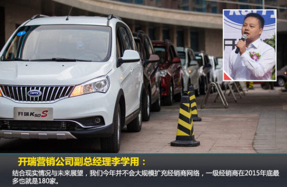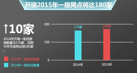 除了新产品的投放外,开瑞也针对旗下经销商网络布局进行了重新部署。和有些车企大规模扩张经营规模的做法不同,开瑞坚持以市场实际需求为准则,对现有经销商逐步完成升级,其中仍不符合标准的则会被取消或者被新的经销商团队取代。“达到180家上下”,这是开瑞对2015年一级经销商规模的规划,这一数字也意味着将比去年多10家。